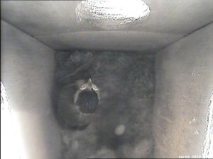 Biggest bird keeps getting up on the windows - think he will definitely go today - the other one does not look big enough as his wings are not as developed. there are also lots of little maggot things in the box. Excitement as a little brown bird tries to look in the box and the mother hisses at it.