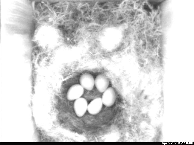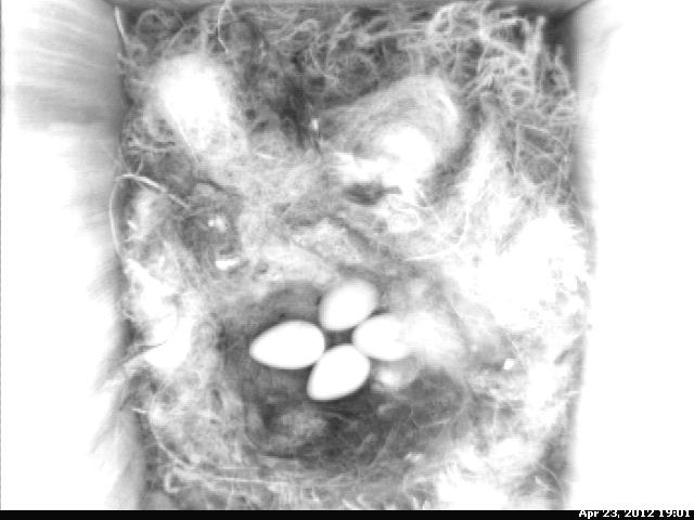 4 eggs in nest!! When did she lay them?? She must have laid them over the weekend and covered them up well. I thought they only laid one at a time. Not sure but there may be 5...